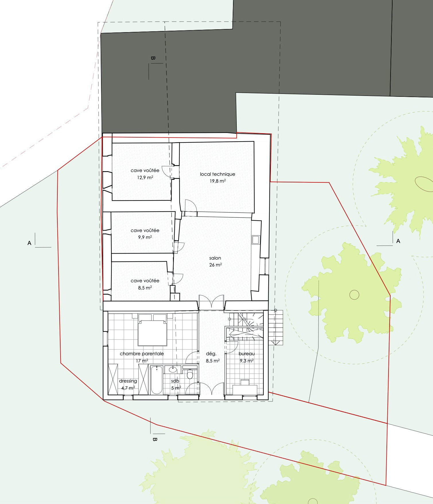 La partie réhabilitée comporte de magnifiques alcôves voûtées au niveau inférieur. Le projet propose que l’habitation se développe donc en majorité sur la partie supérieure. Une différence de niveau importante et de hauteur sous plafond profitent à la création de mezzanines généreuses pour chaque chambre d’enfant.